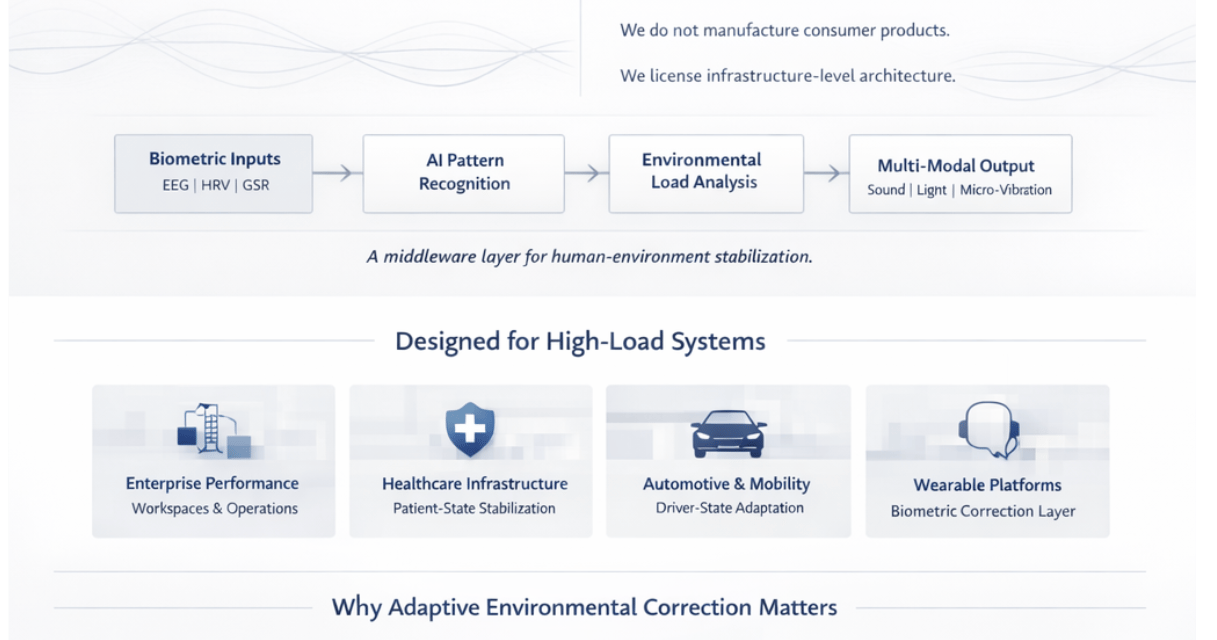 A patent-backed biometric correction architecture designed to stabilize human performance across enterprise, healthcare, mobility, and wearable platforms.